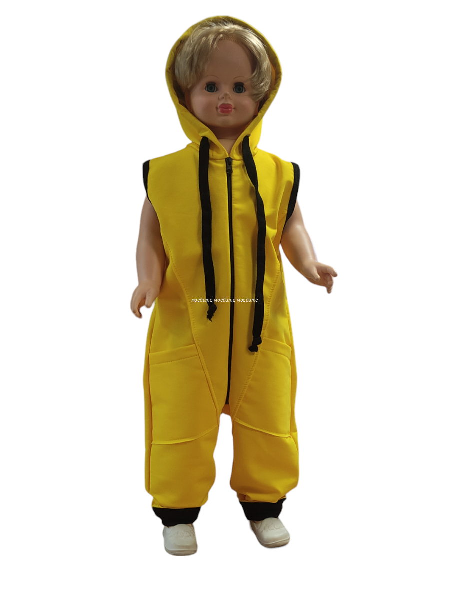 Комбинезон без рукавов, с капюшоном, спереди на удобной молнии. Пройма обработана бейкой из 100% рибаны, снизу на манжетах. Капюшон без подкладки, с люверсами в которые вставлен шнурок.